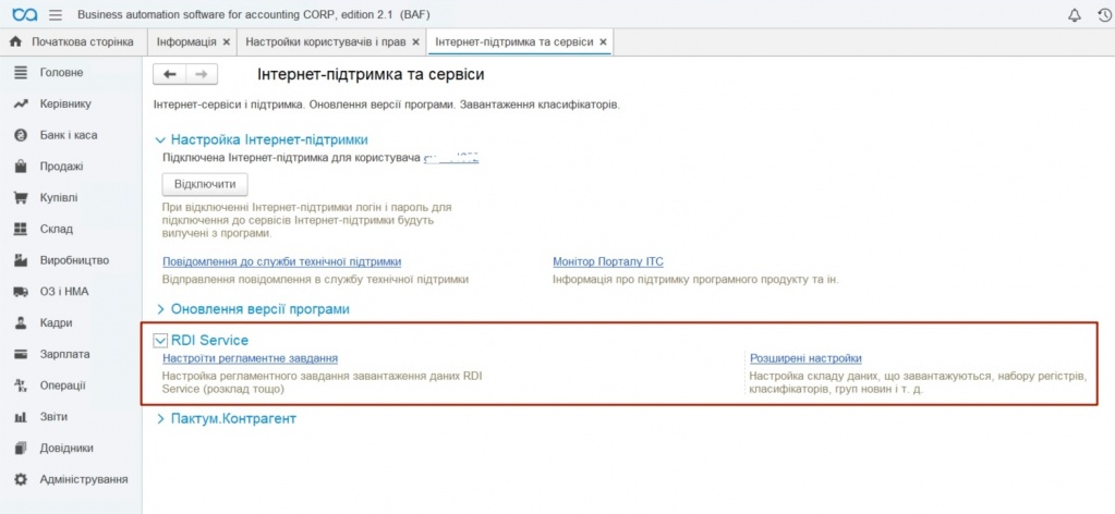 Перш за все, програма має «впізнати» вас як ліцензійного користувача з активним договором ІТС. Це робиться в розділі адміністрування.