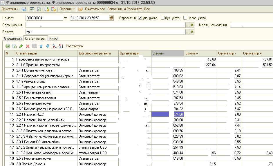 Документ «Фінансовий результат» формується щомісяця. У документ потрапляють зведені дані про доходи та витрати за місяць. Валюта документа може бути будь-який.