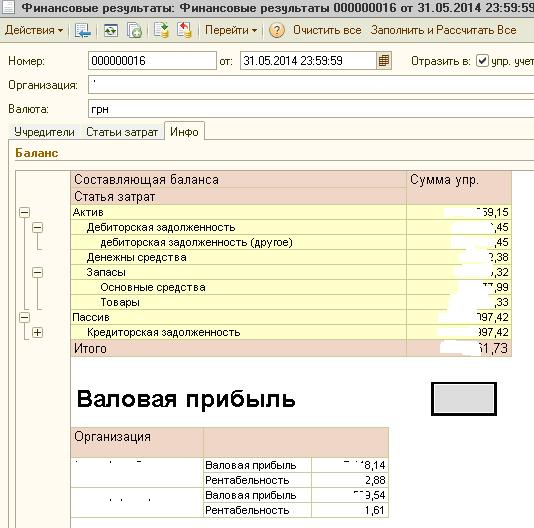 Мал. 2. Документ «Фінансовий результат» на закладці «Інфо». Загальні дані фінансового результату. Валовий прибуток по організаціях.
