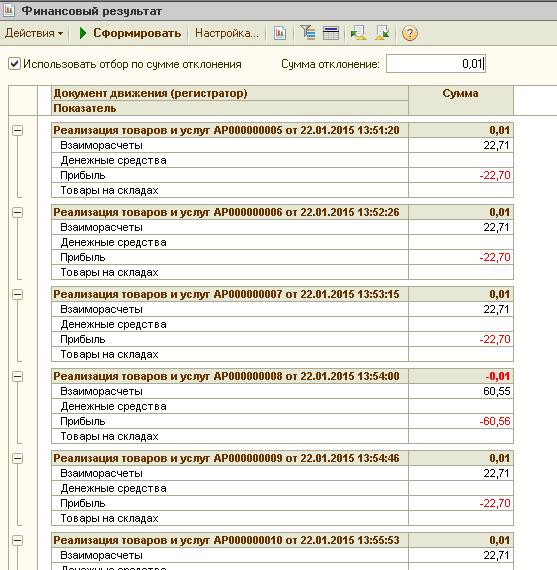 Звіт на мал. 5. показує відхилення по документам, де не виходить нуль по загальній сумі, перерахованих вище статей балансу.