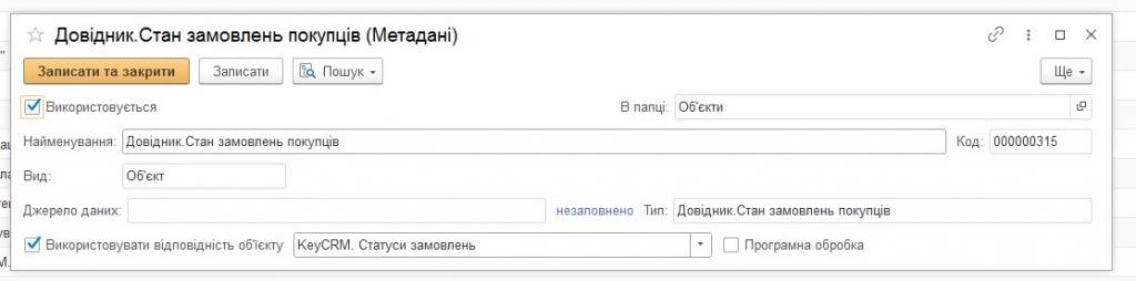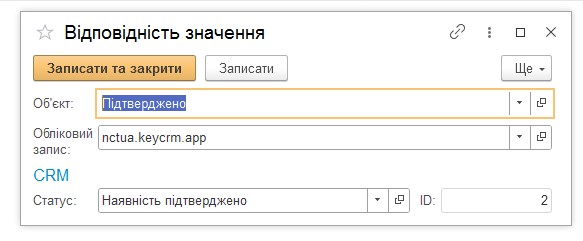 Fig. 6. Establishing correspondence between the value of the "Object" attribute of the "BAS" directory and the value of the "Status" attribute of "KeyCRM".