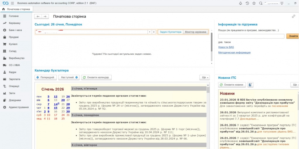 Мал. 4. Робочий стіл бухгалтера: актуальні задачі, календар та стрічка новин ІТС.